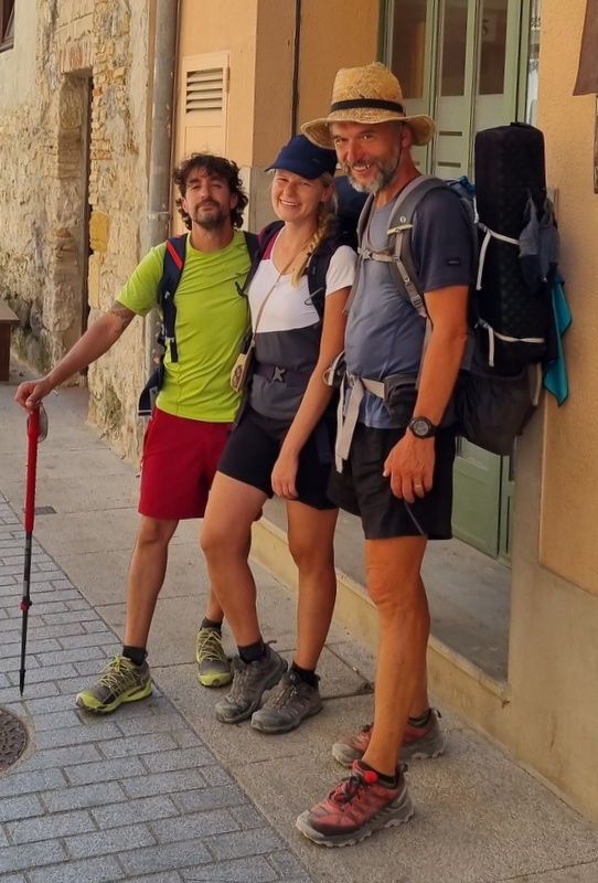 Dorazil jsem s nimi až do Estelly, kde to oba dnes balí. Tak jsme se na památku vyfotili, oni si našli Albergue Municipal a já hospodu, ve které mám problém si vybrat. Skoro vše je vegetariánské či až veganské. Posadili mě k zásuvce, takže mi ani neva, že jim to trvá. Objednal jsem si salát a brambory s česnekovou zálivkou a oni ty brambory asi pochopili jako předkrm. Už je mám skoro v sobě a salát nikde. Ale mám dnes už druhé pivo, takže se na ně nedokážu zlobit.
