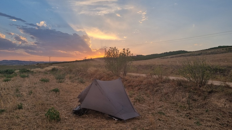 Stan jsem postavil asi kilometr za městem, pár metrů od Camina, na strništi. V dáli párkrát zahřmělo, ale na straně po větru, tak snad to bude OK. Namazal jsem nohy a zítra asi budu dokupovat Compeed. Naštěstí na trase je víc lékáren než potravin. A jdu přes Logroño, tam jich bude ... Dokonce je tam Decathlon, to bych možná mohl vyměnit ta děravá trika. Uvidíme.